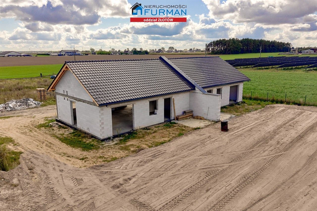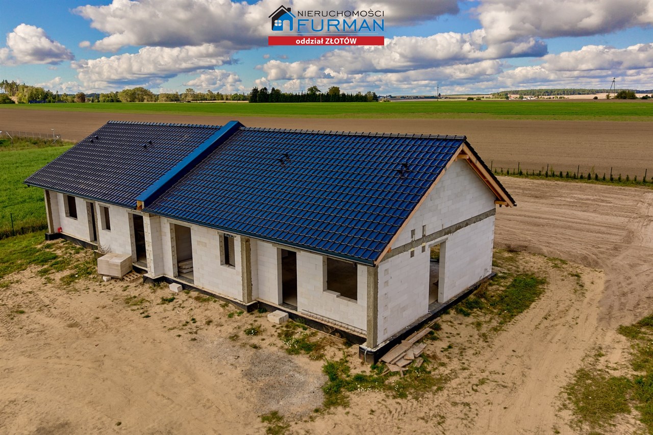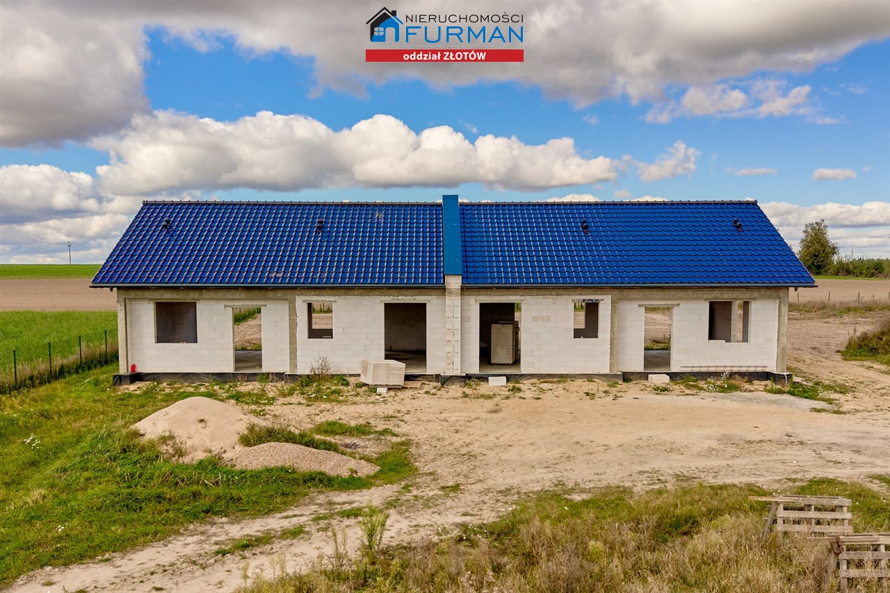 Dom w zabudowie bliźniaczej z poddaszem nieużytkowym, 3 sypialnie, salon z aneksem kuchennym, łazienka z WC oraz oddzielne WC pomieszczenie gospodarcze.