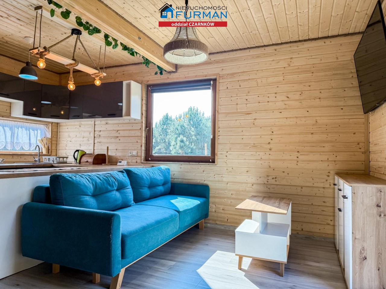 Salon z aneksem kuchennym (24,64 m²) – już umeblowany, czeka na pierwszą kolację przy kominku!