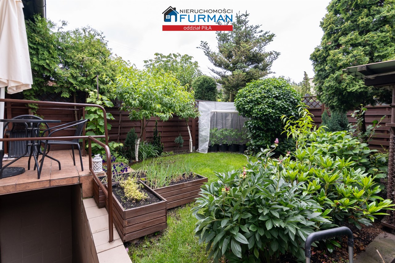 Działka jest w pełni zagospodarowana, obsadzona bujną roślinnością.