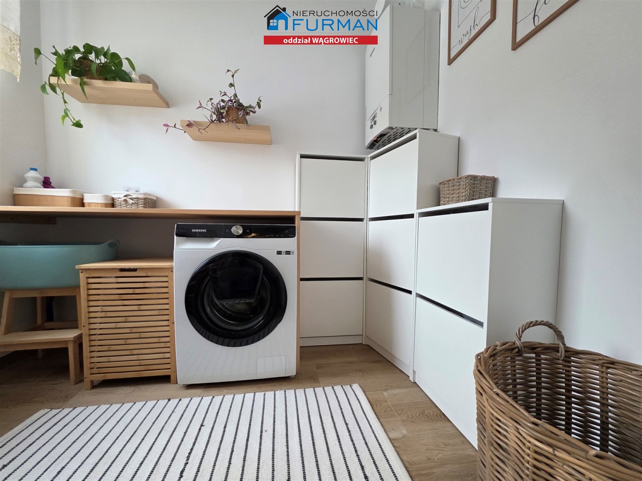 Kotłownia z pralnią o pow. 4,81m2 - tu znajduje sie piec gazowy C.O. Junkers z sterownikiem, zostaje również blat roboczy i regał drewniany