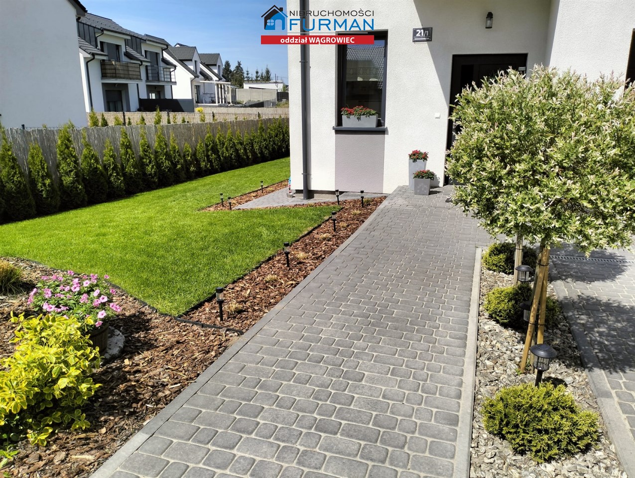 Działka ogrodzona, zagospodarowana nasadzeniami, ciągi komunkacyjne wyłożone kostą brukową