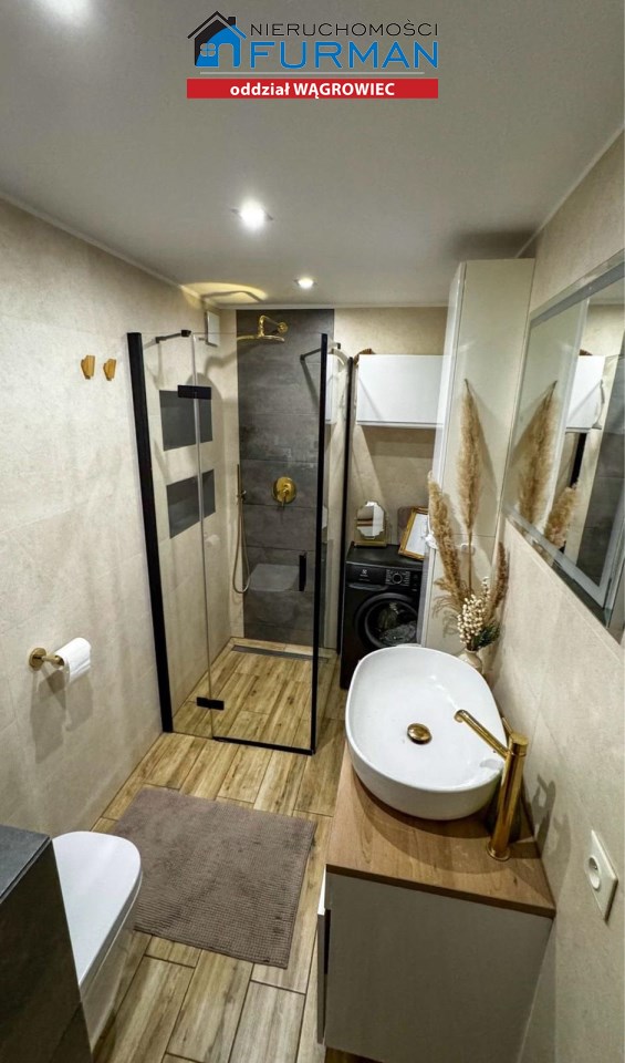 Łazienka z WC o pow. 3,7m2 prysznic, pralka, umywalka, WC, szafki łazienkowe