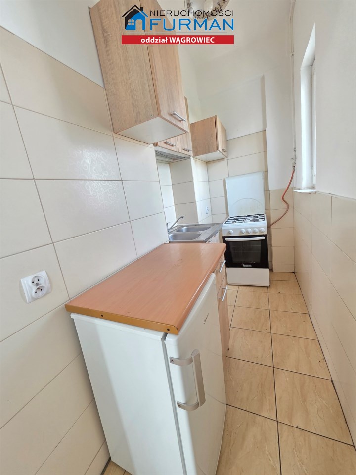 Wyposażenie kuchni: meble kuchenne, mała lodówka, kuchenka gazowa z piekarnikiem