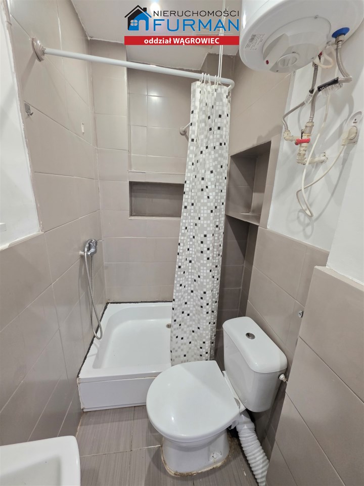 Wyposażenie łazienki: prysznic, toaleta, umywalka, elektryczny podgrzewacz wody