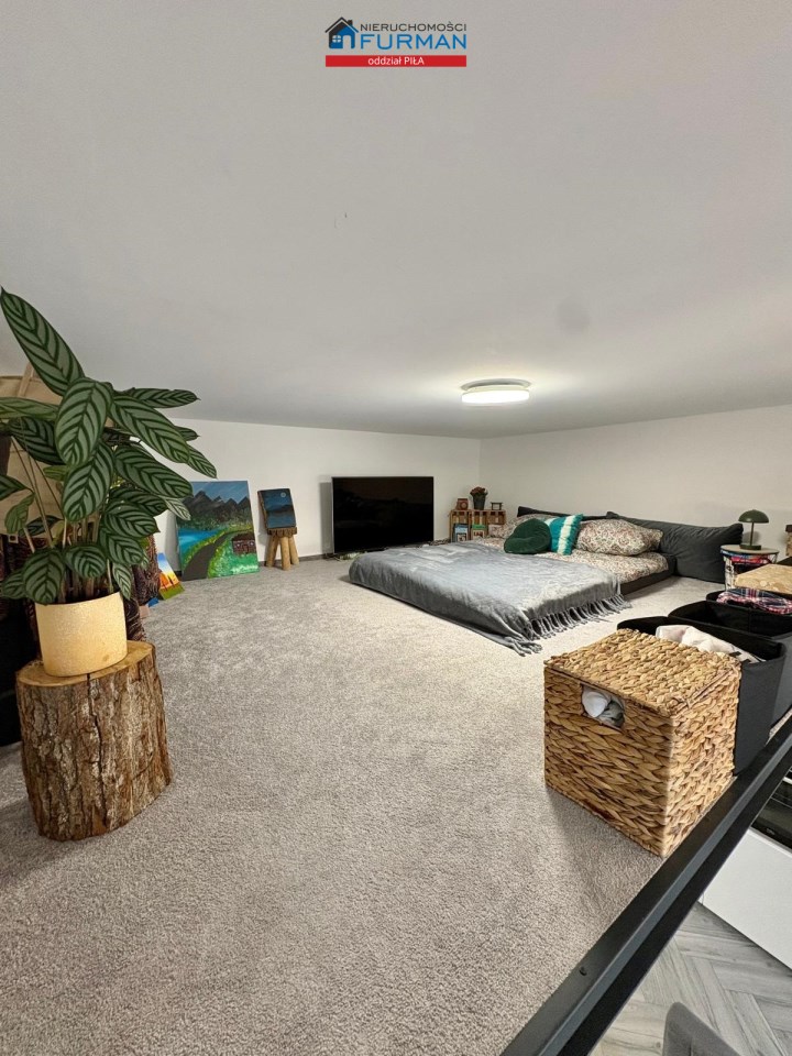Nowoczesna kawalerka o powierzchni 38 m² z antresolą (ok. 10 m²) w budynku z 2022 roku przy ul. Kołobrzeskiej w Pile. Wysokie na 3,5 m wnętrze tworzy przestronną, industrialną atmosferę.