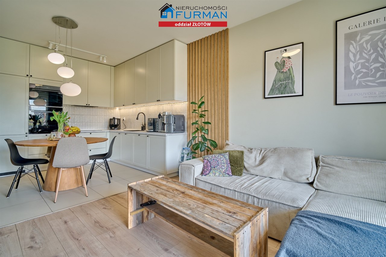 Duży salon połączony z kuchnią oraz pozostawione meble i zabudowy - nie musisz zaczynać od zera.