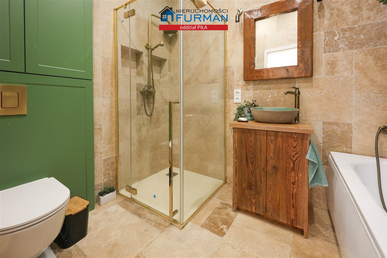 - Łazienka: Stylowa i nietuzinkowa - znajdziesz tu zarówno wannę jak i prysznic, co zapewnia pełną wygodę. Pomieszczenie jest przestronne, wykończone z dbałością o detale.