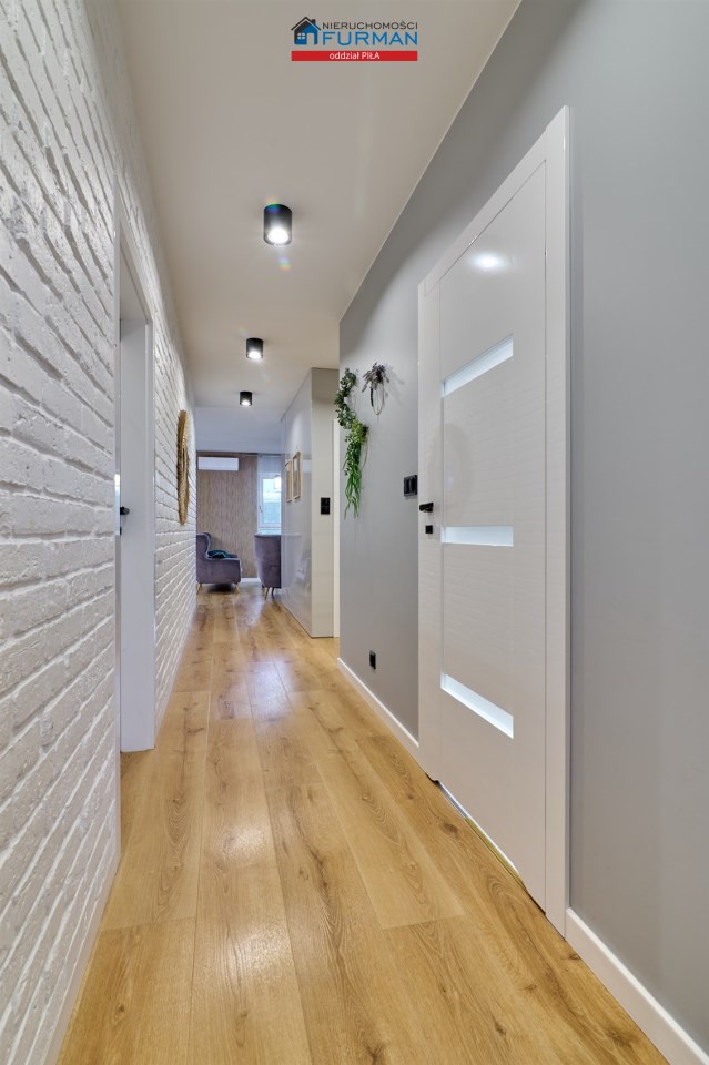 Apartament znajduje się na III piętrze nowoczesnego budynku z 2019 roku, wyposażonego w windę. Powierzchnia 82,23 m² została zaprojektowana z myślą o maksymalnej funkcjonalności i elegancji. Wnętrza wykończono materiałami najwyższej jakości, z dbałością o detale: gipsowane i malowane ściany uzupełnione o cegłę, panele lamelowe, beton architektoniczny oraz tapicerowane panele welurowe. Sufity podwieszane i doświetlane podkreślają przestronność i nowoczesny charakter wnętrz.