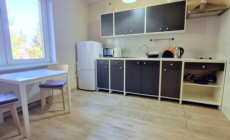 Umeblowane i wyposażone w sprzęty AGD (pralka, mikrofalówka, płyta grzewcza indukcyjna (dwupunktowa), czajnik, lodówka z zamrażalnikiem, wyposażenie drobne (garnki, naczynia, sztućce).
