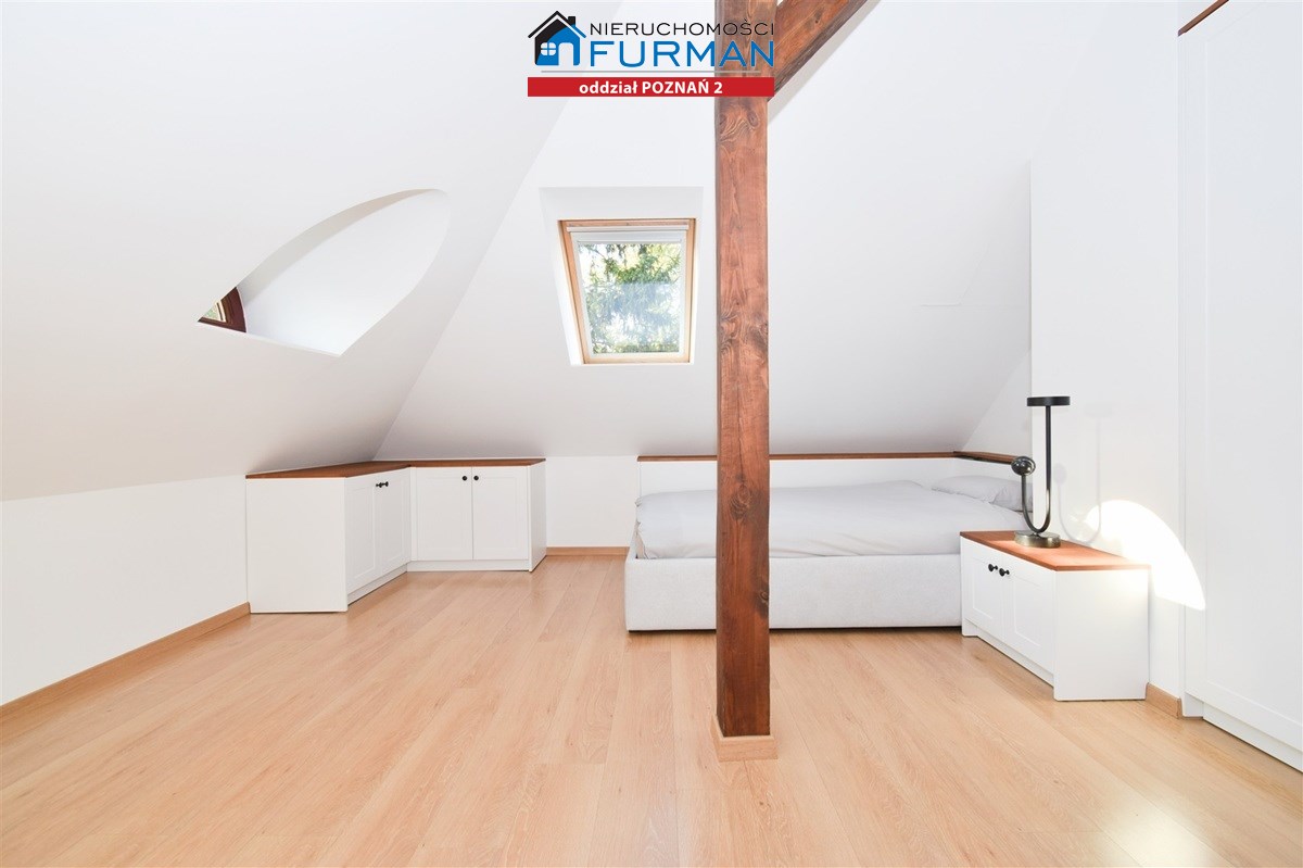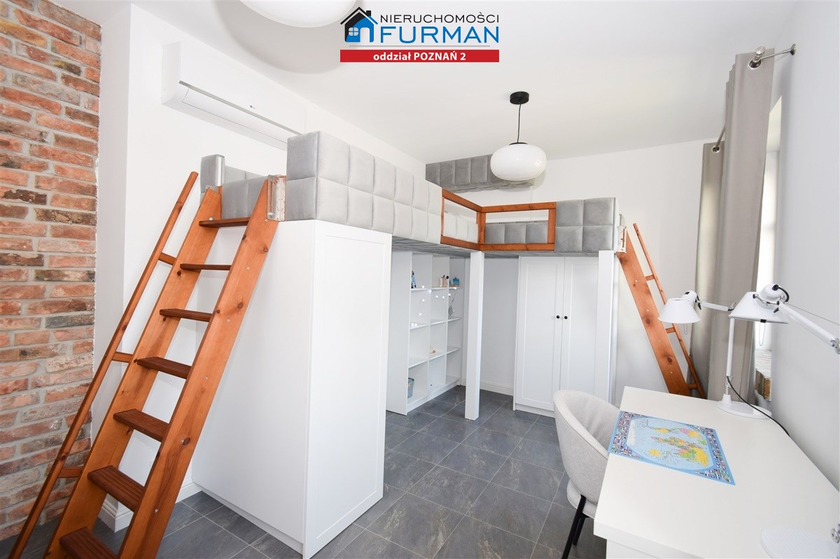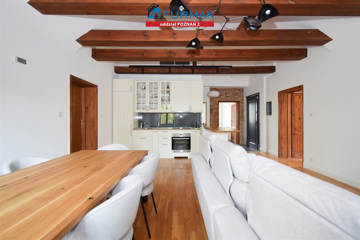 I invite you to rent the unique 4-room, air-conditioned apartment in a beautiful villa bordering the Sołacki Park in Poznan! The apartment is located in the exceptional villa with a beautiful view of the Sołacki Park. The apartment is finished to a high standard and is fully furnished. It has around 102 M2 of usable area. Its surface consists of: - a living room with a kitchenette (32 M2) - 3 bedrooms (14.17 M2; 15.87 M2 (29.83 M2 on the floor); 15.70 M2 (28.86 M2 on the floor)) - bathroom (14.61 M2) - corridor (9.94 M2) - wardrobe The plan of the apartment is attached. Apartment finishing: Built-in kitchen with household appliances (fridge-freezer, oven, dishwasher). In living room there is a big table, chairs, sofa and TV. The bathroom has a bath, shower, washing machine, sink and toilet. There is a built-in wardrobe in the corridor. In the first bedroom there is a large double bed, a built-in wardrobe with lighting, a bedside table and cabinets. The second bedroom has a bed, wardrobes and a height-adjustable work desk. The third bedroom has a bunk bed for two children, wardrobes, shelves and a desk. This room has also a hidden compartment in the wall that could be used as a walk-in closet. It measures approximately 11 squere feet of the floor space. The apartment comes with one covered parking space on the property. Other cars can be parked in front of the building - there is no paid parking zone. includes 1 parking space on the property.Long-term rental (minimum 12 months contract ) Location: Małopolska Street is a place located opposite one of the most beautiful parks in Poznań - Sołacki Park. An ideal place for active leisure - walking and cycling routes. In addition, in the immediate vicinity there is Lake Rusałka (about 1.5 km), and a bit further Lake Strzeszyńskie and Kierskie. Małopolska Street is perfectly connected. The nearest tram stop is only 120 m away. In the immediate vicinity there are restaurants, shops, and the University of Life Sciences. Due to the nature of the buildings, the proximity of the park and the location in the center of Poznań, the area is considered the most prestigious in the city. Rental price: PLN 8000 / month + ca. PLN 880 admin fee (includes advance payment for cold water and garbage fee for 1 person)+ utility costs (gas and electricity) Deposit: PLN 16,000