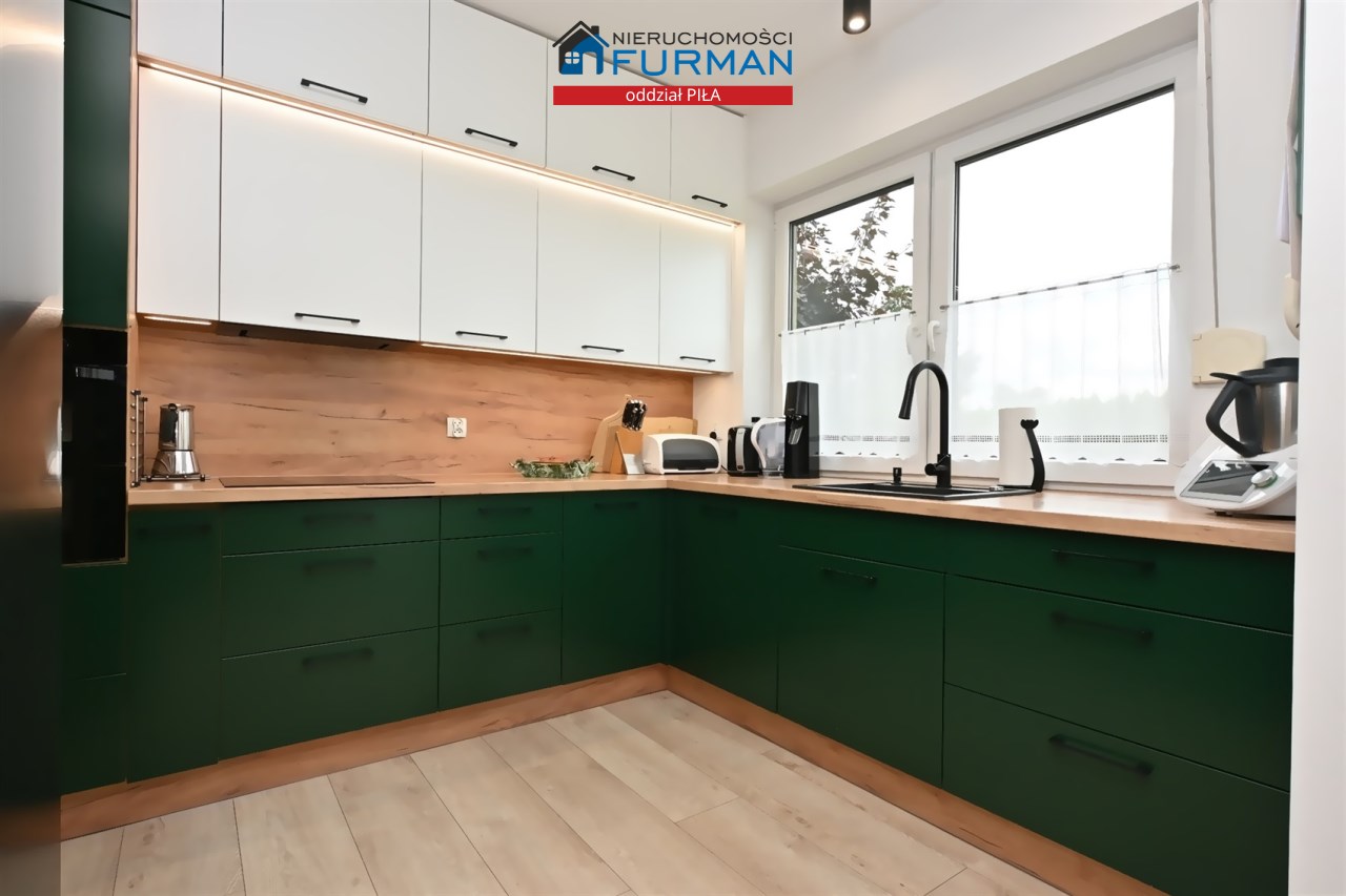 - Aneks kuchenny (ok. 8m²) z zabudową kuchenną wykonaną na indywidualne zamówienie. Zmywarka, piekarnik. Na podłogach w salonie, kuchni i korytarzu jednolite panele które dodają klasy