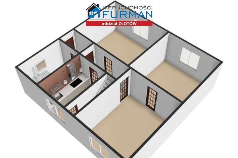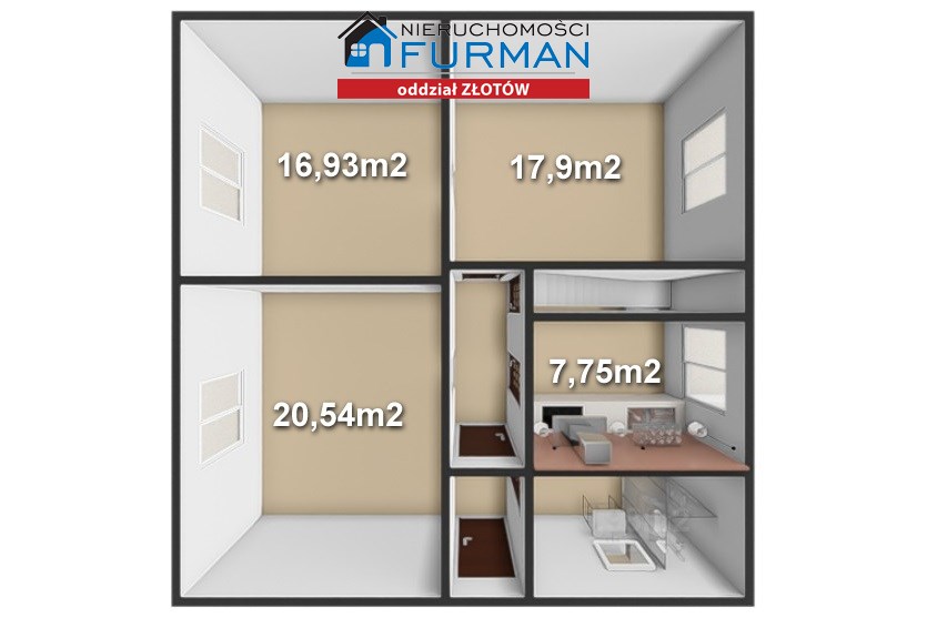 Oferowana część domu skała się z 3 pokoi o powierzchniach 20,54m2, 17,90m2 i 16,93m2, jasnej i oddzielnej kuchni o powierzchni 7,75m2, łazienki wraz z WC o pow. 6,01m2.