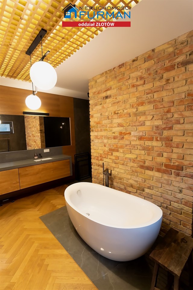 Wyjątkowa sypialnia z pokojem kąpielowym. Duża sypialnia z widokiem na ogród i wyjściem na taras na którym poranili z kawą są wyjątkowe. Pokój kąpielowy z gustowna wanna wolnostojącą i częścią z natryskiem. Pokój kąpielowy z dużymi lustrami, elementami drewna i stylowej cegły