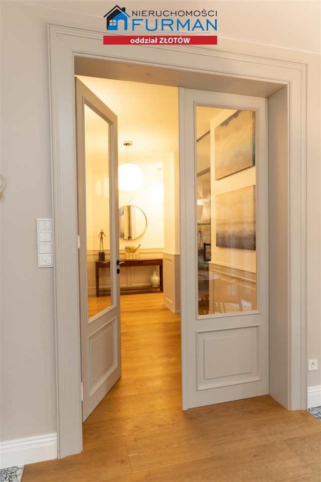 Do kolejnej części domu prowadzą nas  z kuchni z jadalnią stylowe drewniane drzwi z dużym przeszkleniem  za którymi znajdują się: