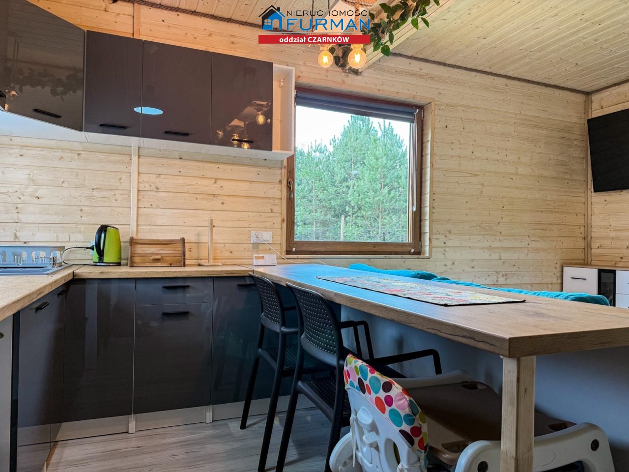 Salon z aneksem kuchennym (24,64 m²) – już umeblowany, czeka na pierwszą kolację przy kominku!