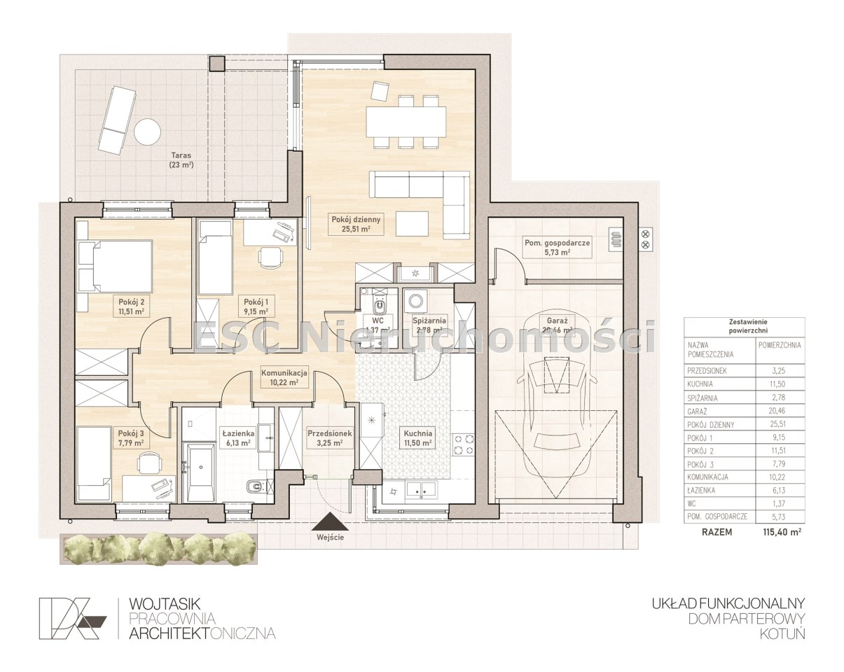 Funkcjonalny układ pomieszczeń zapewnia efektywne wykorzystanie całej przestrzeni domu: pokój dzienny o pow. 25,51 m2 z wyjściem na taras, oddzielna kuchnia o pow. 11,50 m2 ze spiżarnią o pow. 2,78 m2, trzy pokoje o pow.: 11,51m2 ,9,15m2 ,7,79m2, łazienka o pow. 6,13 m 2, wc o pow. 1,37 m2, komunikacja o pow. 10,22 m2, przedsionek o pow. 3,25 m2 oraz garaż o pow. 20,46 m2 z pomieszczeniem gospodarczym o pow. 5,73 m2.