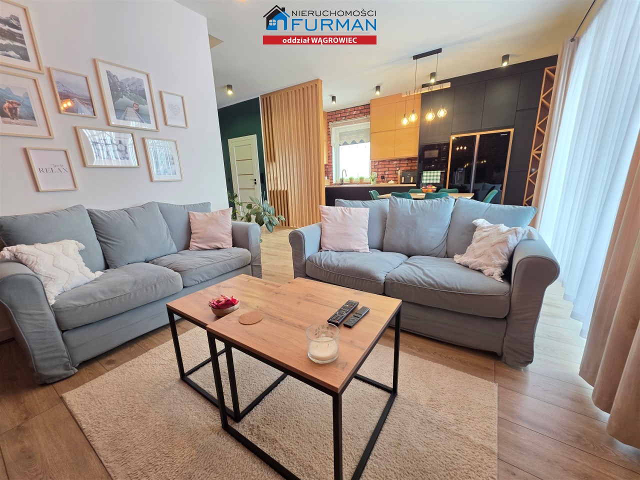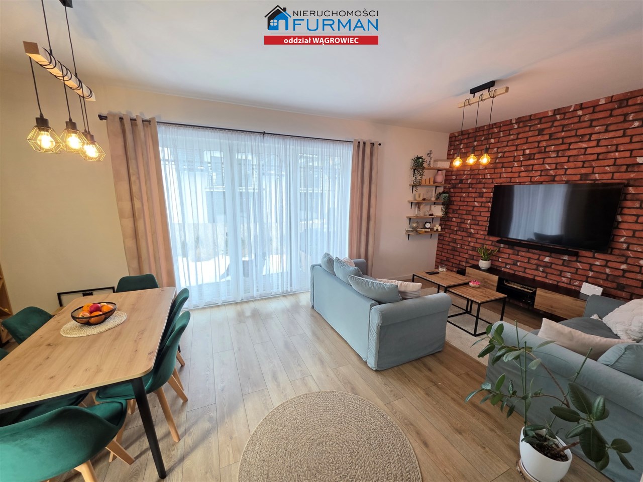 Salon o pow. 27,37m2 - połączony z jadalnią i aneksem kuchennym. W cenie zostaje 1 sofa bez f. spania, szafka RTV, półki ścienne, stół i 8 krzeseł. Wyjście na taras z pergolą z płótnem