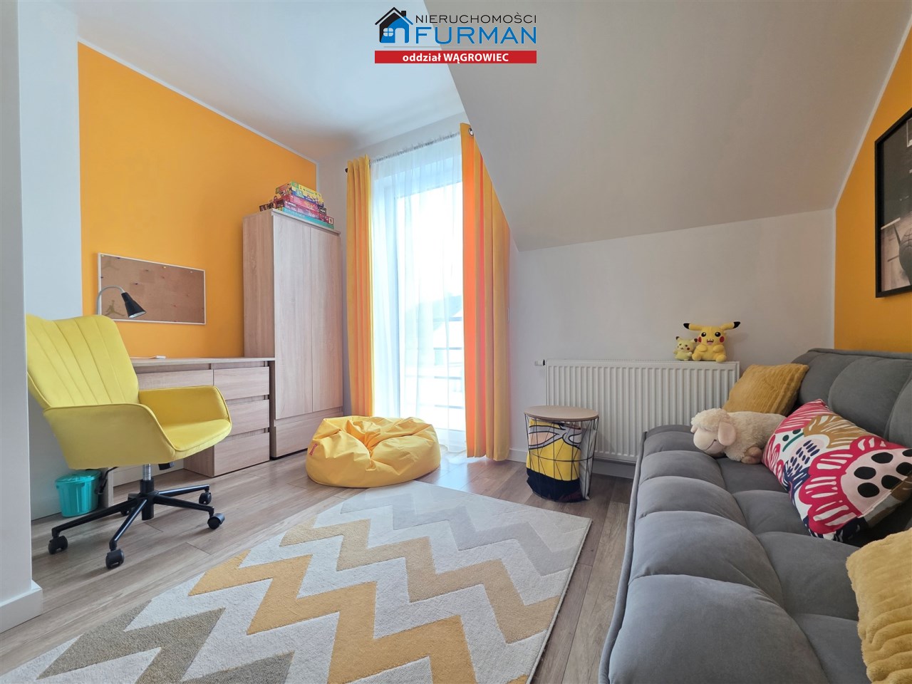 Pokój o pow. 9,85m2 - kanapa, biurko, fotel obrotowy, szafa, komoda