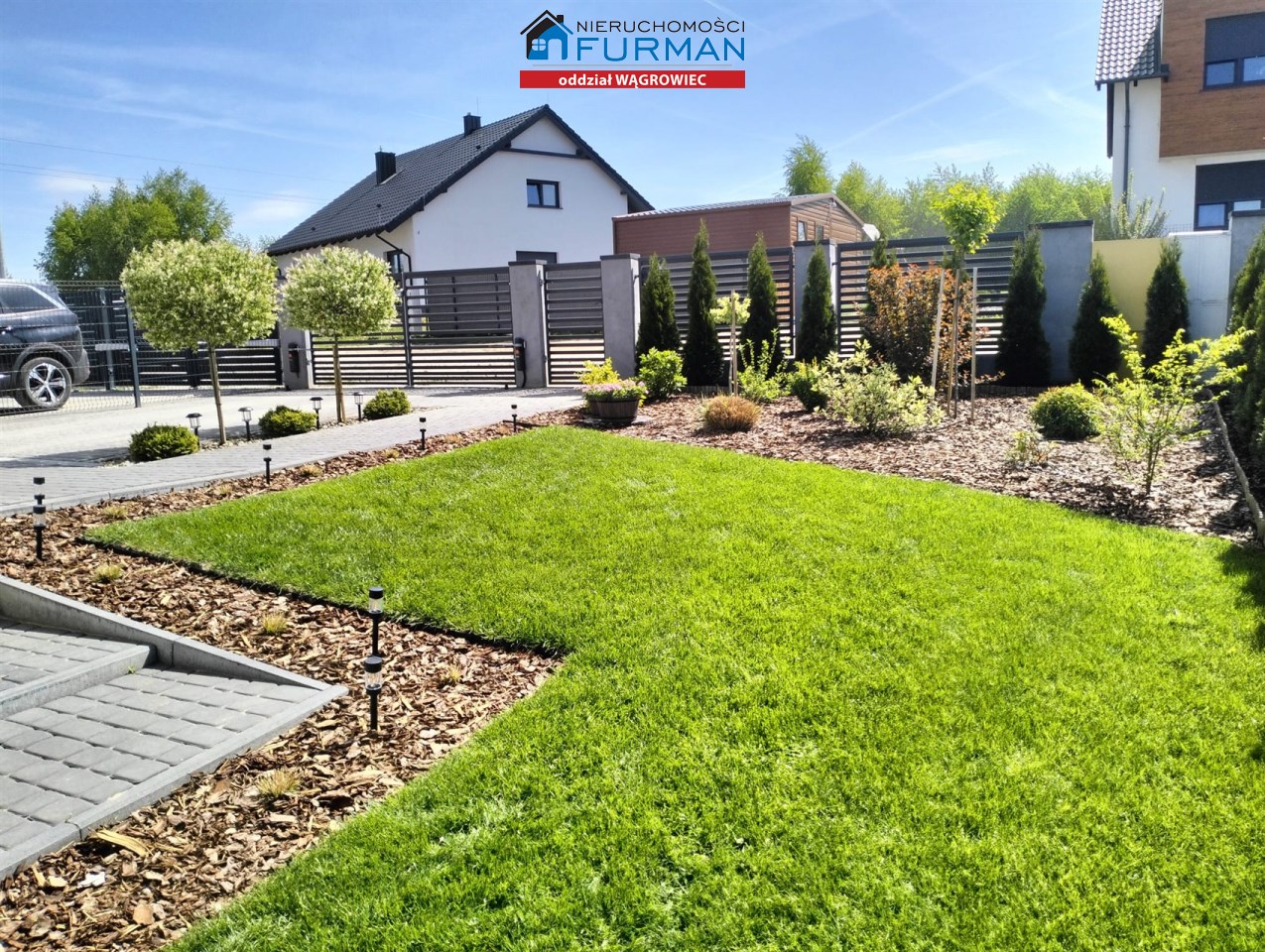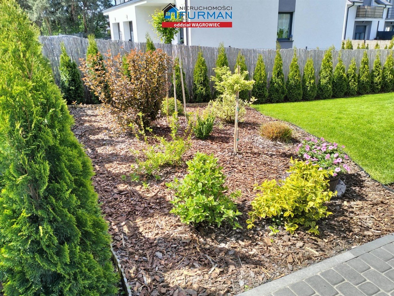 Działka ogrodzona, zagospodarowana nasadzeniami, ciągi komunkacyjne wyłożone kostą brukową