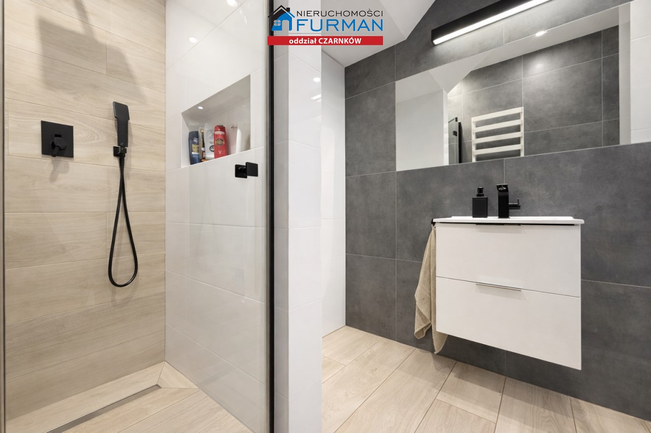 Na parterze znajduje się także jedna sypialnia , idealna jako pokój gościnny, gabinet lub sypialnia dla domownika, a także łazienka z prysznicem ,