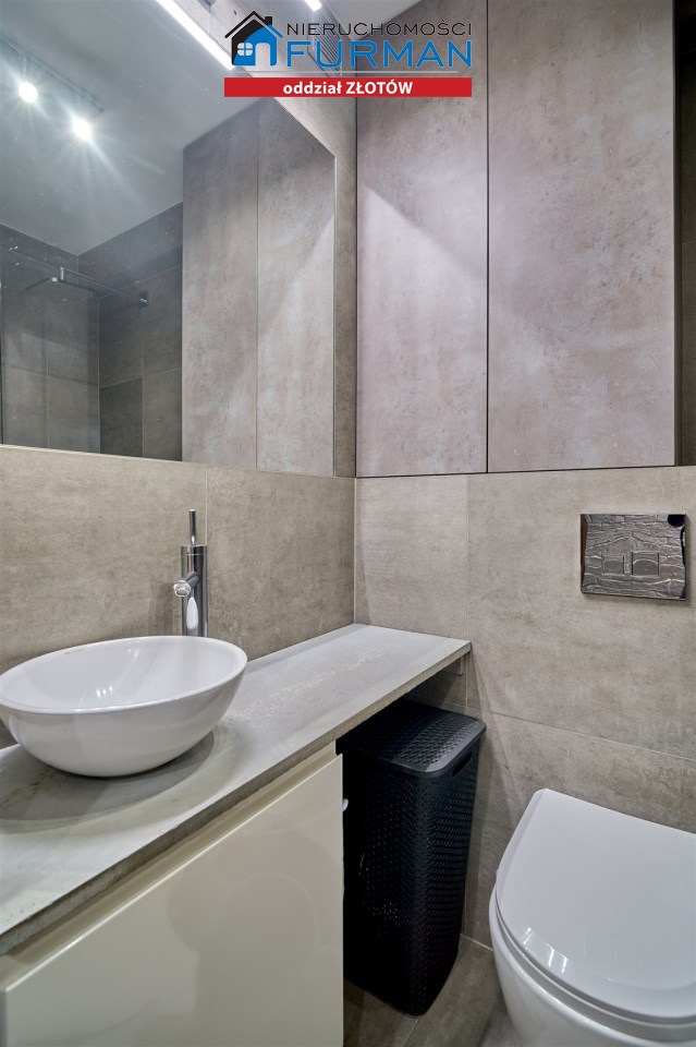 Łazienka została wykończona w surowym, nowoczesnym stylu inspirowanym betonem architektonicznym. Znajdziesz tu prysznic typu walk-in z odpływem liniowym oraz WC na stelażu typu Geberit. Minimalizm, estetyka i funkcjonalność w jednym.