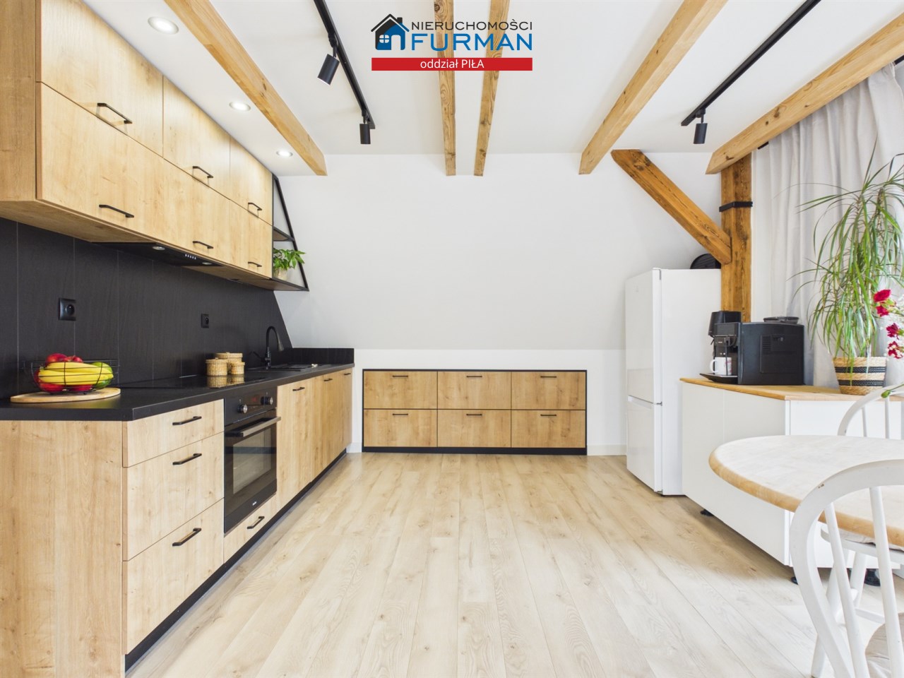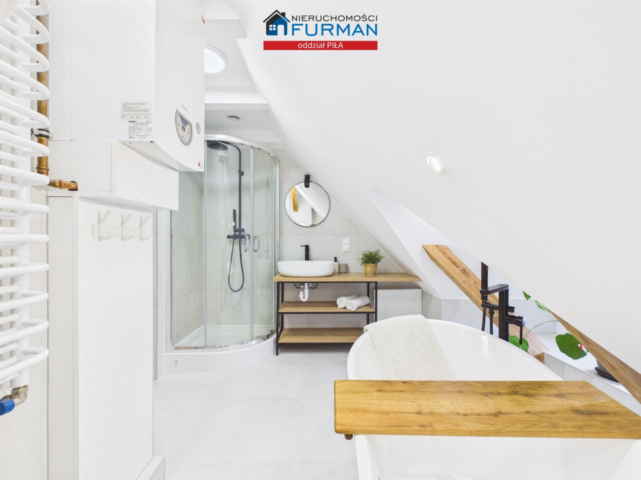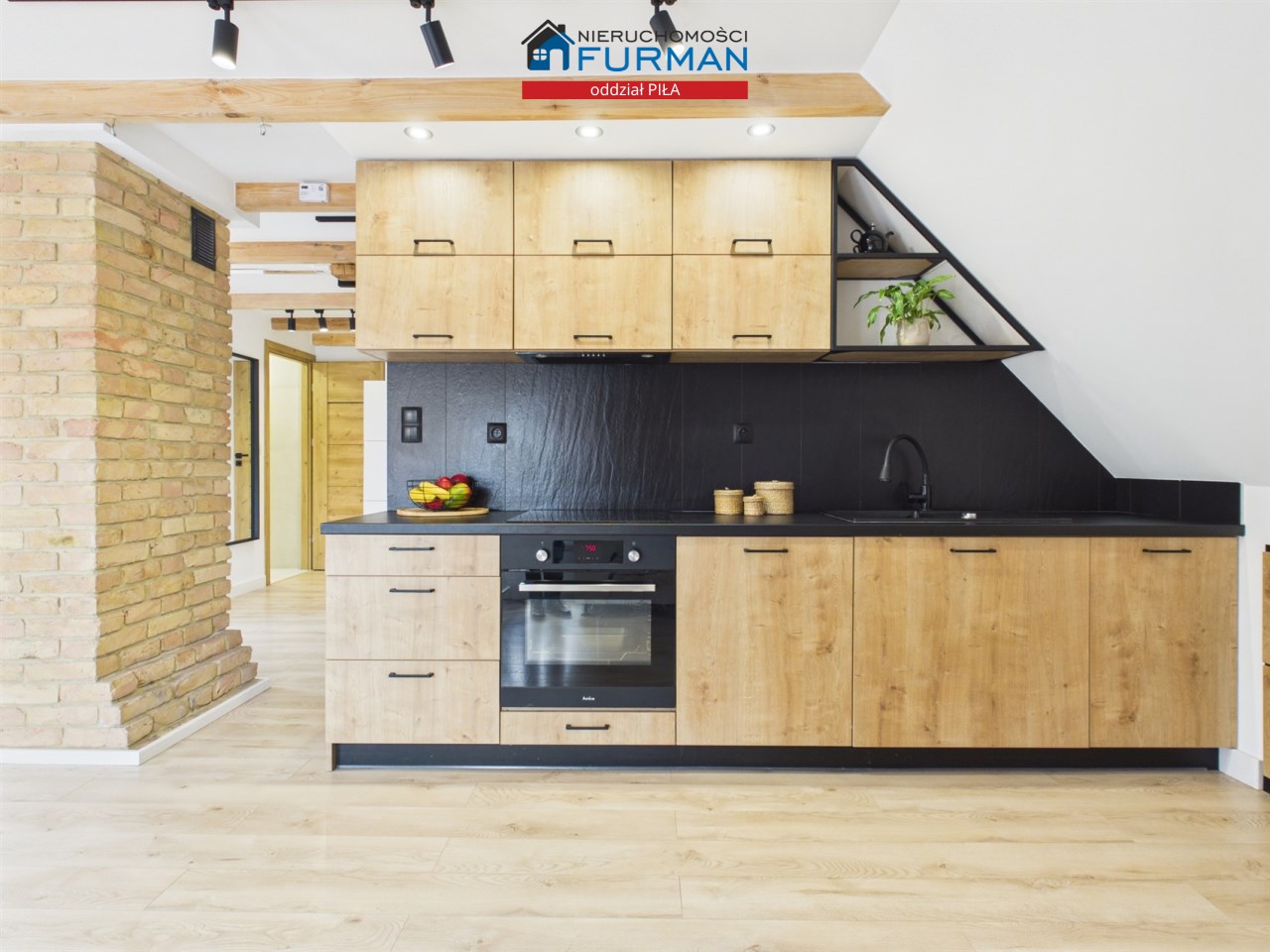 Nieruchomość sprzedawana jest z umeblowaniem widocznym na zdjęciach. Kuchnia wyposażona jest w sprzęt AGD (lodówka, płyta indukcyjna, piekarnik, zmywarka, okap). Okna PCV zapewniają dobrą izolację termiczną i akustyczną. Ogrzewanie gazowe (piec dwufunkcyjny) gwarantuje wygodę użytkowania, a klimatyzacja na piętrze znacząco podnosi komfort w cieplejsze dni.