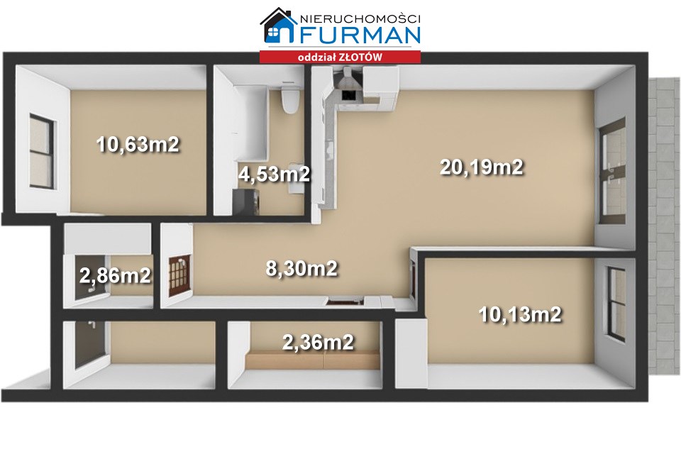 - Dwie sypialnie: 10,63 m² i 10,13 m² - idealne dla domowników, pokoju dziecięcego, gabinetu