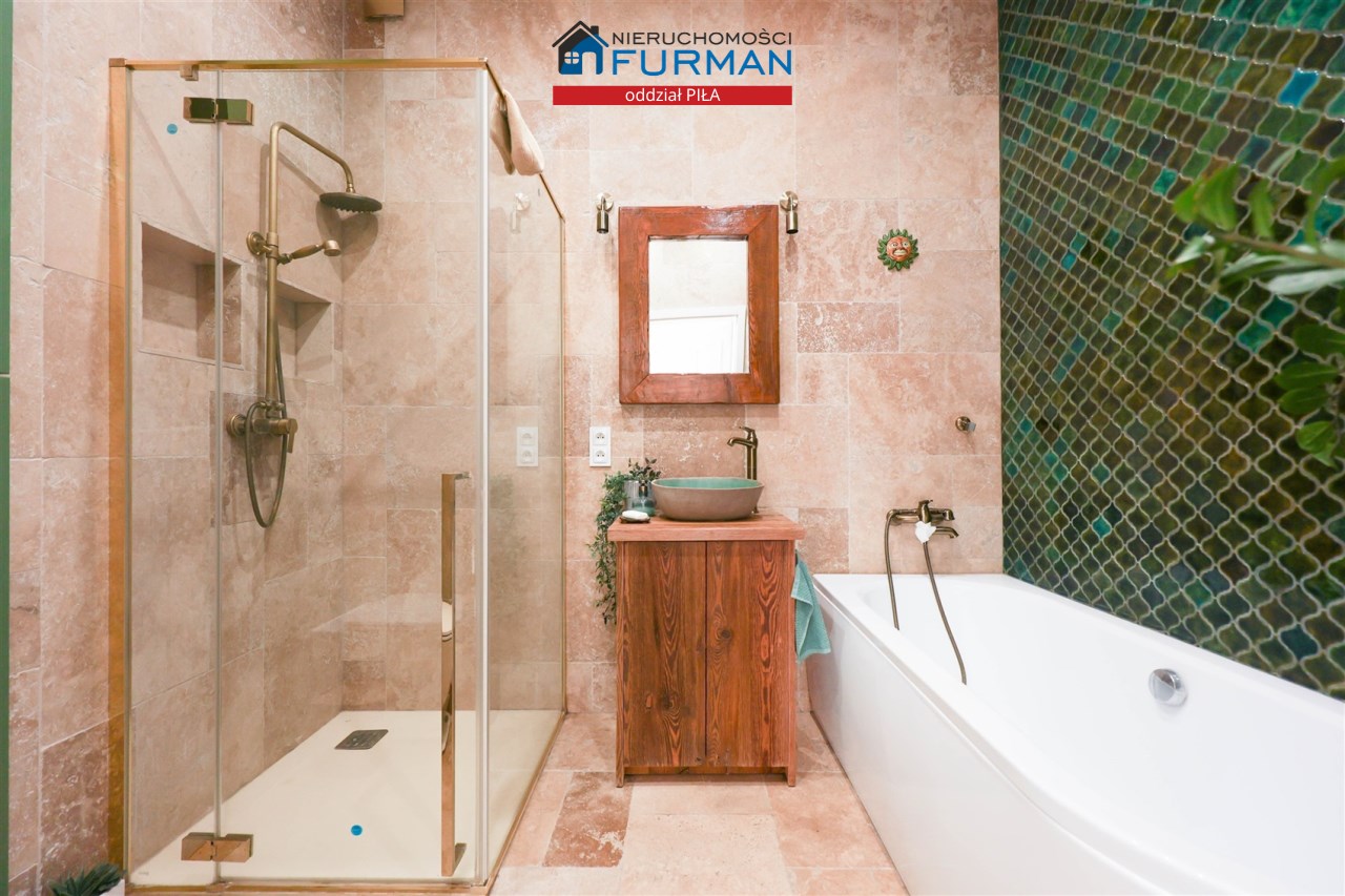 - Łazienka: Stylowa i nietuzinkowa - znajdziesz tu zarówno wannę jak i prysznic, co zapewnia pełną wygodę. Pomieszczenie jest przestronne, wykończone z dbałością o detale.
