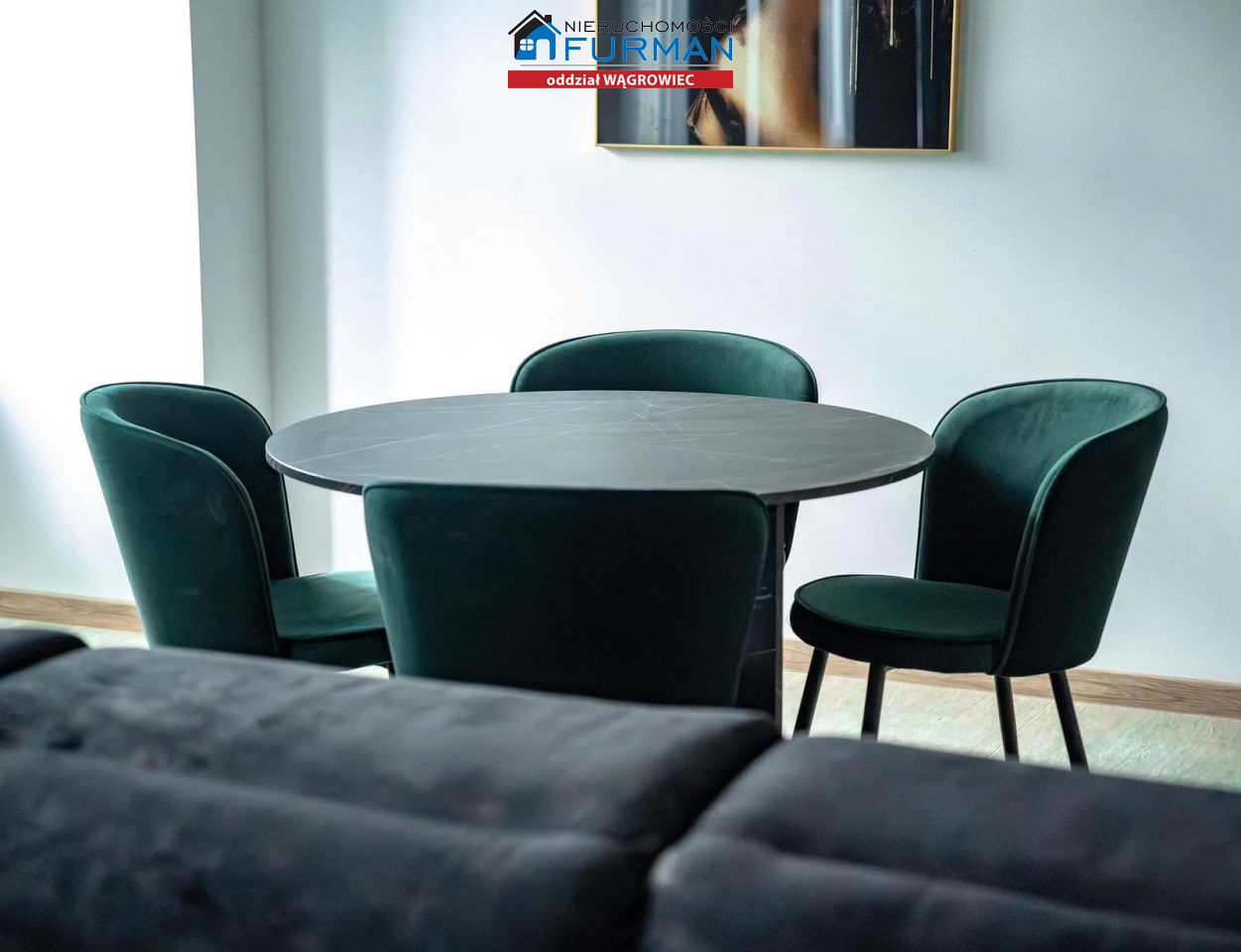 Część jadalniana ze stołem i wygodnymi aksamitnymi krzesłami
